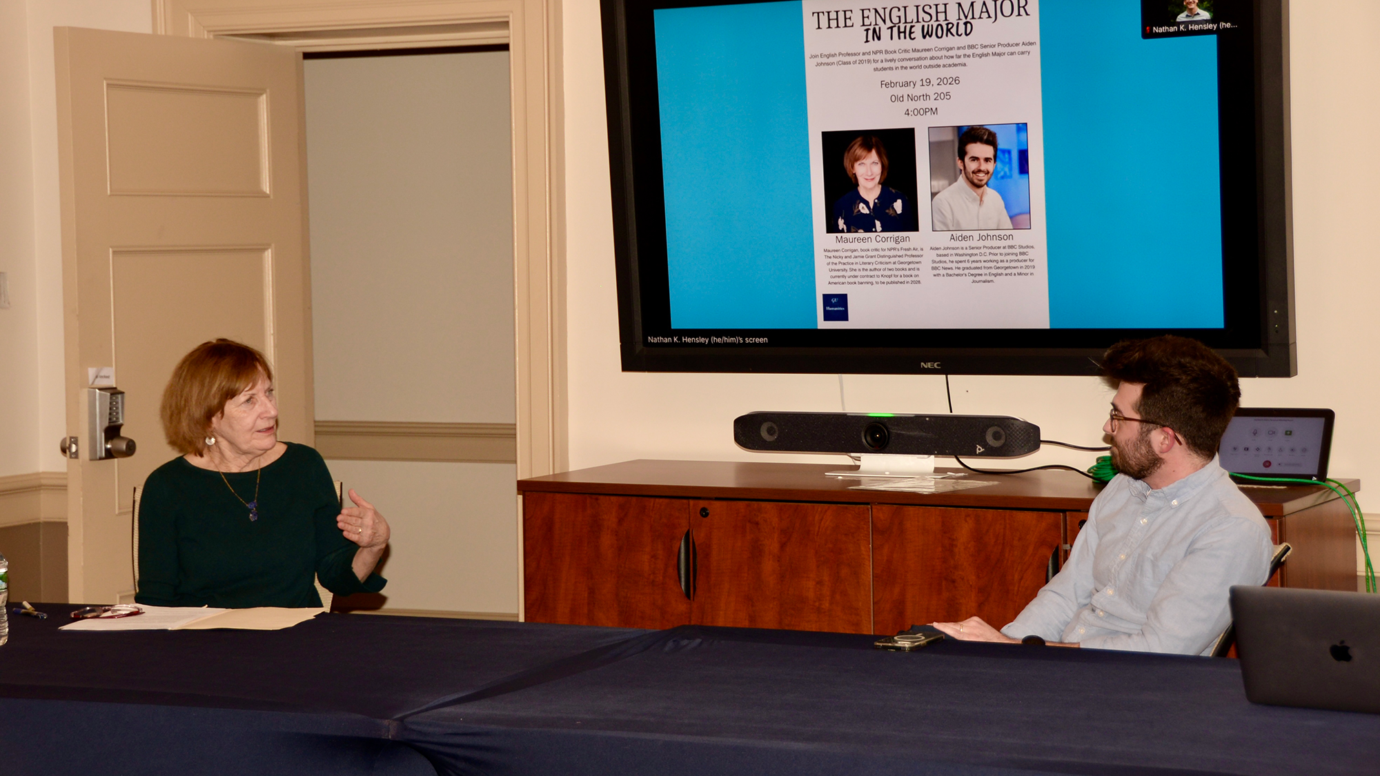 The inaugural event featured a conversation between English Professor Maureen Corrigan and her former student and English alum, Aiden Johnson (C’19), who works as a senior producer at BBC Studios. (Kelyn Soong)